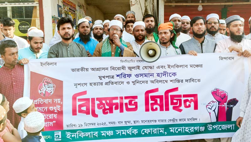 হাদী হত্যার প্রতিবাদে মনোহরগঞ্জে বিক্ষোভ মিছিল